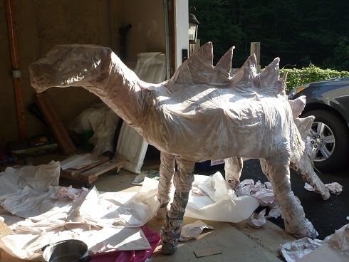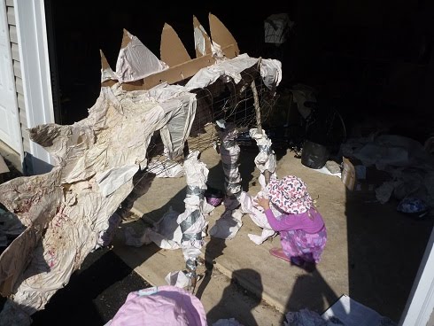 On this day, trashosaurus got a styrofoam head which we attached and covered with more paper mache.