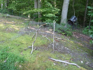 We looked around the yard for some items to help us make the structure (bone system) of our dinosaur. The previous owners left a lot of stuff back in the woods, so we scrounged up some left over wire fencing and formed that into a basic body. We used sticks for the legs and attached it all together with plastic ties. (It got a head later.)
