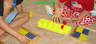 Egg carton toss — They threw two pom-poms into the