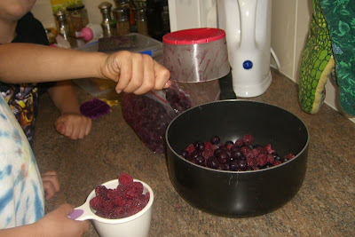 We used 6 1/2 cups fruit (2 1/2 raspberries, 4 cups blueberry)