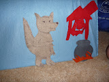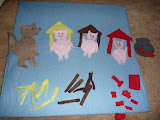So, our first theme was farms. I pulled out an egg puzzle; farm puzzle, a number of books (including The Three Little Pigs) and made a little felt board activity (I’m not a great artist, but the kids had fun with it!).  DD was anxious to reenact the story herself and made several different versions of the story (where wolf was the ‘good guy’ etc.)