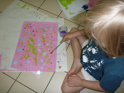 I had the kids watch the slide show at Eric Carle’s Website about how he paints the tissue paper for making his children’s books. We followed his instructions making decorative paper.