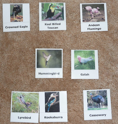 Today after sorting the five vertebrate groups (substituting these new bird cards for the others) we watched the following bird videos. I started with the galah and lyrebird (of Australia) today because they are familiar to the kids. We see galahs daily and we’ve read a wonderful series that includes a lyrebird as one of the characters: