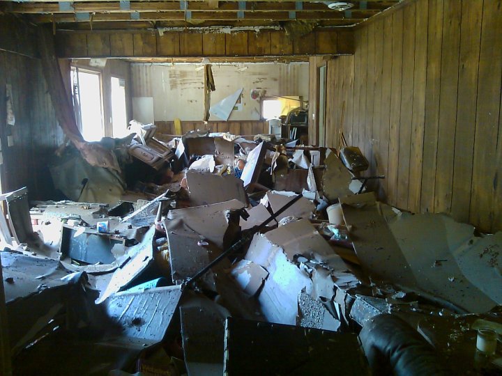 Here’s another picture sent by my sister. This is the livingroom/study and dining room — looks out on the backyard. Yes, that’s insulation hanging on the lamp chain. And on the right, that leg stick up near the far door, that’s the piano. Again, this is one of the rooms on the first floor.  The water went at least 5-7 feet higher than this room.  This level of the house is about 15 feet (or more?) off the ground.