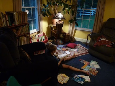 Life indoors still isn’t quite as tranquil as it is outdoors. Still, I have various parts of the house that are really coming together. One of the first areas we tried to get organized was the homeschool room. This is our new book nook. I came across LD reading a long chapter book to DD last evening and just had to take a picture!