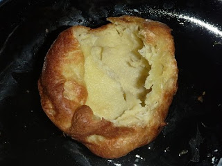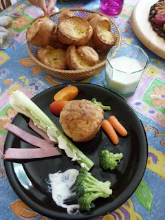 The oven we had for the past 12 years didn’t work very well (I had to rotate things halfway through or else one end of the pan would be burned and the other unbaked!). I tried numerous times to make popovers, but they always stuck to the pan and basically failed to “pop.” This evening I tried making them again for the first time in a long time and they were a HUGE hit! So here’s our evening meal — and I’ll share the recipe below for those of you who have a reliable oven!