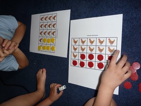 DD had this chicken grid game from prekinders.com in her workbox today for math. We played with two dice and she had to try adding them together. That’s quite challenging for her (4 1/2), but it added a new dimension since one die is to simple. I was amused that LD came RUNNING over to play a few rounds with us! |