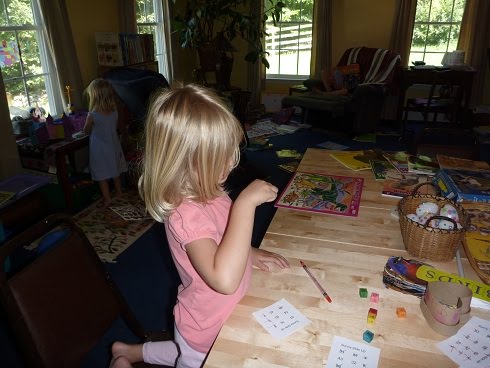 This week was really quite special.  As I mention in the post below, LD and I had some wonderful talks about life, the miracles of life, the events that shape us, the paths we take along this amazing life of ours.  Something almost as touching, was when I realized that we were here.  We have come so far in these past four months and now we are once again a warm family, bonding, learning, living and thriving together. This picture of course, can’t capture my heart and emotions, but there DD and I were playing Sunny Side Up (again and again!), there was ED happy, engaged and choosing independent (!) work, and there was LD snug up chair beyond with a book, Totally Amazing Insects. I felt like we had arrived — we’re home!