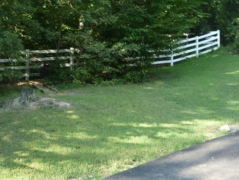 A couple of days ago I started working on the blueberry bed. The picture above is the grassy hill (which is super-steep and nearly impossible to mow anyway) and this second picture shows my slow progress shoveling out sod and beating the dirt out. I managed to get about six feet by six feet cleared. I have fond memories of my Mom and Dad doing this. We had a lot of gardens around our yard and my folks worked hard together to have fruit beds (blueberries, strawberries, apple and pear trees); a large vegie garden and general gardens with mountain laurel and rhododendrons. Anyway, this bed I’m working on is for the blueberry bushes I mentioned the other day that’ll be coming in the mail in a couple weeks.
