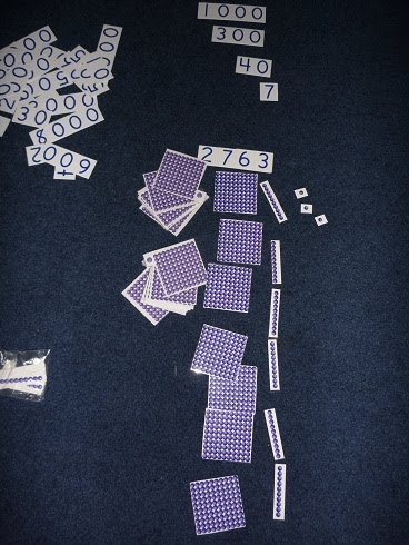 | It had been a while since LD did this place value activity, so I added this in to our other activities. I really like the purple paper beads which I printed out from here. I bound 10 sets of 100s with a brad to make a 1000 bead bunch. While we also have actual Montessori beads, I’ve used this set lots and lots. You can see in the picture that LD had to build the number by laying the thousands on the bottom, then 100s, tens and units. |