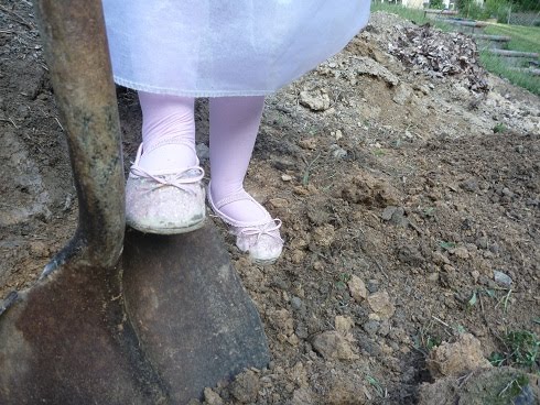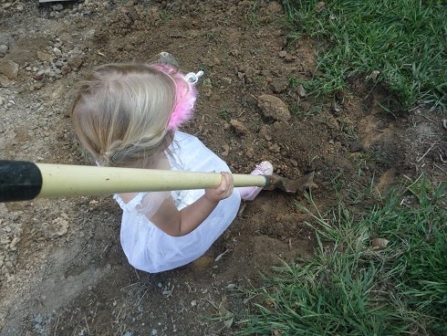 Meanwhile, I continue to try to make a blueberry garden–digging out the grass/sod, beating the sod to get rid of the dirt, trying to loosen the soil, etc. [Later: I just had to add these pictures of ED helping me in her princess garb. Too cute!!] It’s slow, tedious and semi-strenuous work. Unpacking is still an unfinished job. Ugh. I might spent an hour or two tackling one area of the house, but then the kids doing their creative things elsewhere, which usually winds up meaning HUGE cleanup times. Creative messes, as I like to tell myself. There just seem to be so many projects we need to tackle (putting gutter-guards over the rain gutters to keep out leaves is one of Daddy’s big projects, for example).