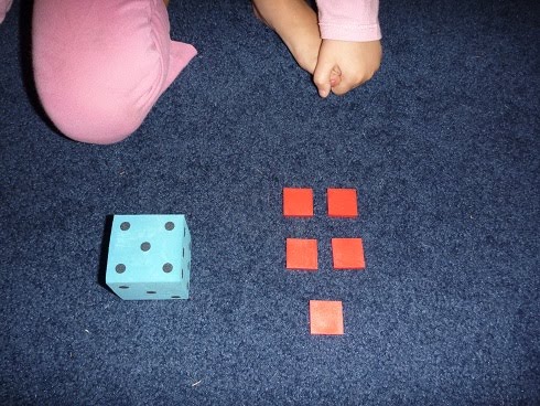 Odd Man Out — I had never gone over the concept of odd and even with DD.  Today was the day.  To reinforce these concepts, I pulled out 6 tiles.  She had to roll the die, get that number of tiles and determine whether each counter had a partner (even) or if one was alone/the odd man out (odd). Pretty simple, right?!