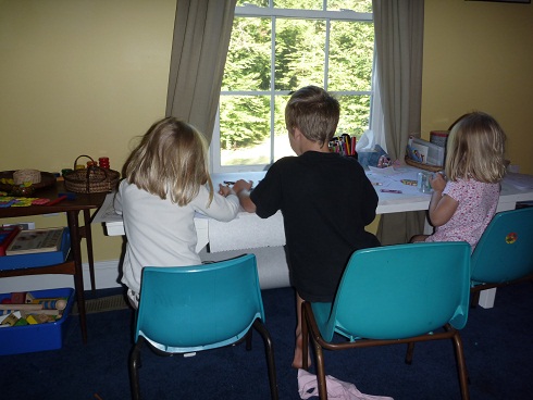 There have been times when I set out theme tables, but lately I’ve just been going through the cupboards and rotating in various materials they haven’t used since our move. It’s been a joy in particular, watching ED (2 1/2) who now does so much on her own with little or no direction/help from me leaving me free to work with the other kids as they need it.