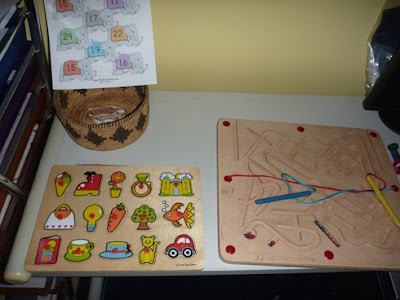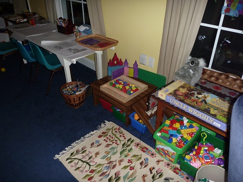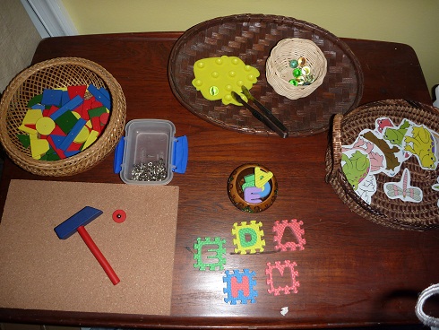 We have just moved and are using what we have on hand to create an environment where the kids can be self-directed. We have some very low tables and I bring out new things daily or every other day. For example, in the picture above, I set out a board game and a bead stacking activity.Other things I’ve set out recently include board games, Montessori cards, sorting and tonging activities, pattern blocks, dress-up bears, card games, and so forth. I’ve seen other people set out their materials on bookshelves, but I find that the kids actually stand/sit at these tables and do the activity right there (or on the floor nearby). That works well for us.