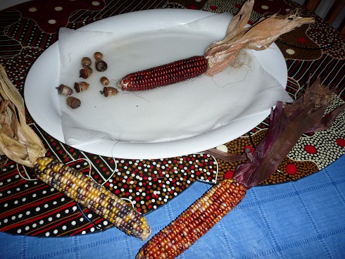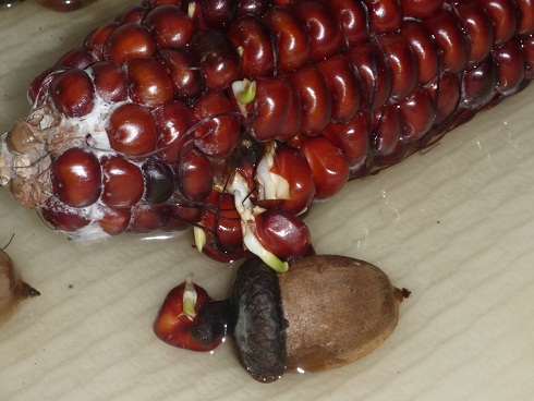 And after a week, there was quite a bit of growth. Our acorns, on the other hand, have grown nothing but mold. We also have some popcorn seeds in the water, but there’s been no change there either. DD decided she wanted to add her Indian corn cob as well and they declared that it’s a race to see whose corn will grow fastest. Sigh… anyone else’s kids compete about most everything?! |