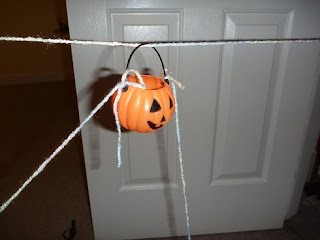 3) another piece of string is attached to the other side of the pumpkin handle and is wrapped around a knob so that DD can pull it into her room
