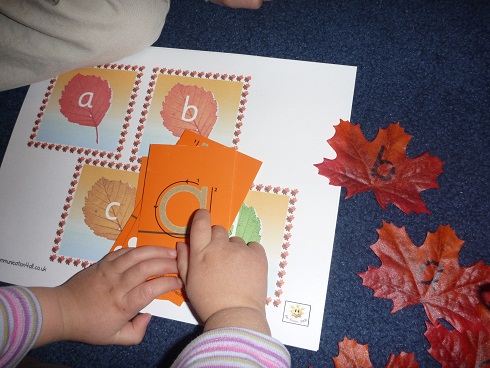 I used some leaves I got from a dollar store and wrote letters on them to place on top of the letter card sheet. Those were from that new website I found the other day communication4all.co.uk. ED seems to be enjoying the sandpaper letters at this point too. You can make them yourself, but I bought mine a couple of years ago.