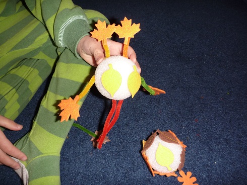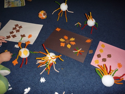 I brought out pipe cleaners, fall themed stickers and some styrofoam balls and let them at it. They all came up with such different ideas. EDs were suns, DD made a fall ball and a fall creature and LD made rockets.