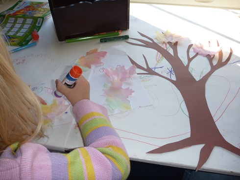 It has been several months since we last did an eye-dropper activity. I cut coffee filters in the shapes of leaves and let ED go at it. Then I had to start cutting up napkins because she wanted to continue on and on and on! She spent at least 30 minutes on this!