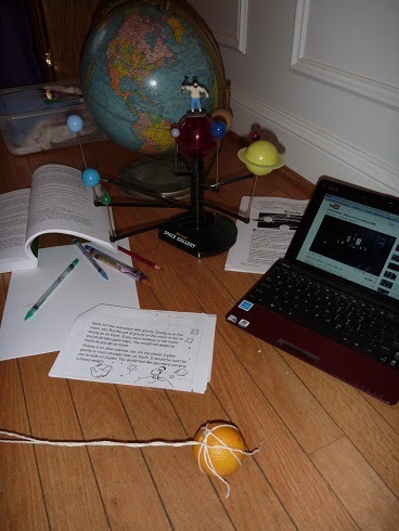 *We talked a little bit about how planets orbit the sun — and I took an orange (on a string) and spun it my head and said “this is a planet being held in orbit around the sun by gravity.” Then I let go and said “NO gravity!!” The kids laughed and I did it again, but accidentally tossed the orange over the fence and into the woods!