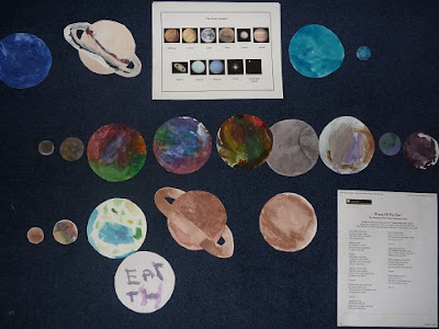 We did the planets in May. You can see what we did here http://theadventuresofbear.blogspot.com/2010/05/universe-day-2-3-4-and-5.html and http://theadventuresofbear.blogspot.com/2010/05/universe-planets.htmlI love the planets your kids painted. They look really nice!