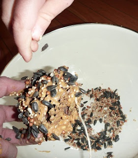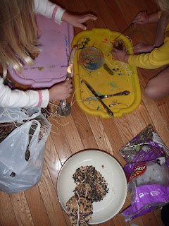 We also took the opportunity inside to warm up with hot chocolate. We each made a pinecone bird feeder or two (you know, pinecones covered with peanut butter and bird seed. I made these as a girl scout years ago!) We hung them on the gate that leads out to the creek and woods beyond our house.