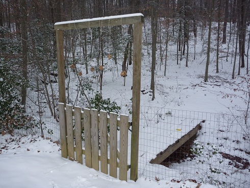 I guess you can’t really see them, but our pinecone bird feeders are hanging off the gate. |
