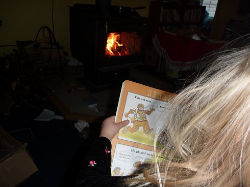 Meanwhile, the past three days our furnace hasn’t been working!! Luckily we’ve had a lot of help this season getting our fireplace in order. A friend gave us a HUGE stack of uncut logs. Uncle T and Dad loaded the trailer and brought them back. Then we were lucky to have the pure muscle and brawn of Uncle S to chop up the entire pile for us (with a dull axe we had on hand!). ED has helping to keep the fireplace clean. And we’ve been spending lots of cozy, cuddly time in the warm homeschool room in front of the fire.