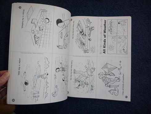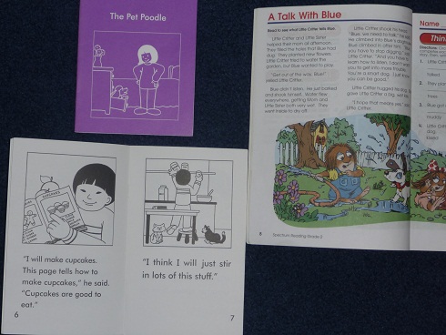 It has been a while since I talked about DD’s reading (she’s 5). We are still working our way through EPS Primary Phonics Storybooks. I can’t recommend this set of readers highly enough! I have found them absolutely perfect after the Bob Books. Each book (like the purple one at the left and the one straight below it) is 16 pages long and the story is reasonably good. DD reads a new one each day — we’re up to Level 5 now. Luckily I bought them used from another homeschooler, but knowing how well they’ve worked for my son and daughter I would have bought them new.