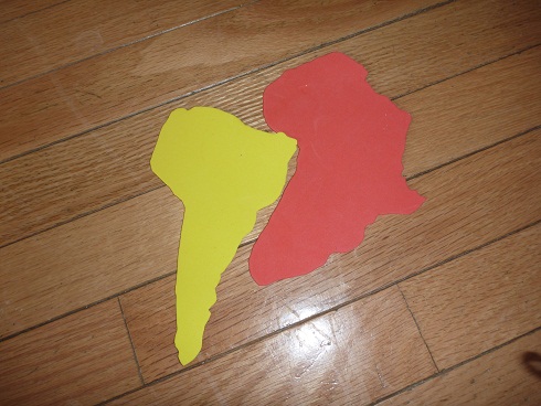 Next we did a little activity to show how continents could move without some giant hand pulling them apart. This was perfect for the kids, since it let them “see” the continents move without our touching them. I cut the continents out of foam. The kids folded construction paper. First we set the continents close together with a piece of playdough to weight the continents down.