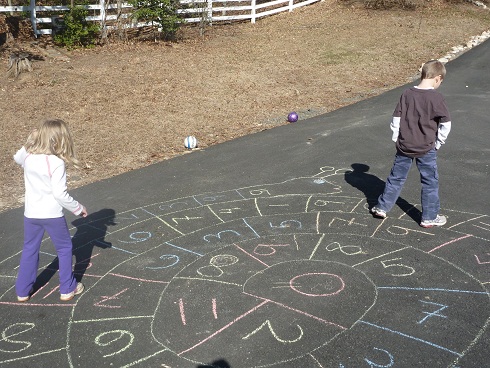 LD continues to work on his first multiplication tables from 1s to 6s — with lots of skip counting along the way. Today I had him working on 4s mostly. It has been quite a long time since we’ve done active math games outside and we had a reprieve in the weather. So we set up a chalk math snail again. LD had to multiply each number by 4. DD had to add 2 to each number. And I helped ED shout out each number as she jumped from square to square.