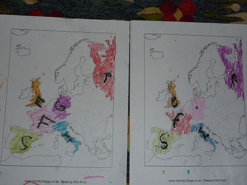We’ve talked about where these fairy tales originated (mostly from England and Germany) and we’ve been locating them on our map of Europe. I printed out an outline map from activity village one day to color in some of the countries. We’ve also been playing a geography game of Europe, but it’s such a good game I’ll make another separate posting about that.