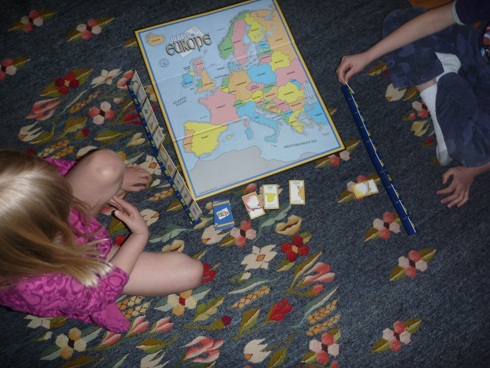 We’ve done a lot with geography of Europe this semester. That’s in part because three of our unit studies have focused on Europe — our world music class, the Middle Ages unit and our fairy tale unit. I ordered this game back in February, but with the flu and pneumonia descending upon us we never got to it. We’ve had a blast with it the past week or so.
