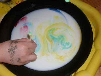 3) Place a Q-tip in dishsoap. Then carefully place the Q-tip in the center of the plate without moving it around. The colors start to move and swirl as the soap displace some of the milk fats.