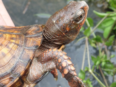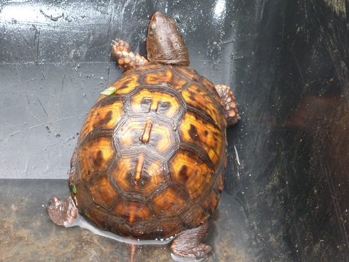 We think this box turtle is a male. We’re guessing this is a fairly young turtle (6 years or so) after counting the growth rings. |