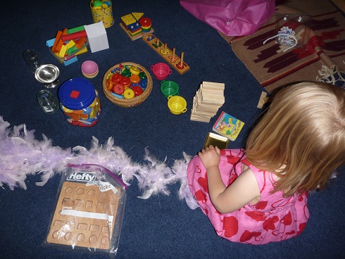 You were talking about how difficult it is to work with your five year old when your 3 year old is playing. Goodness, I know how that is! My little one wants to be in the middle of things. It’s slightly easier to involve her now that she’s older. So, if I’m playing a math game with DD (5) then I’ll let ED turn over the cards or spin the spinner, etc. and ask her to identify the numbers. (top picture)Sometimes I just reach into the cabinet and bring out five activities and spread them around us hoping something will catch her attention (second picture). And sometimes, I wind up homeschooling with ED climbing on my back and head (no kidding!!). Ugh! So, it’s often a challenge — and I’m often left feeling that I haven’t “done enough” quality work with DD (or LD). The other ‘problem’ is that the kids play so happily that it’s hard to draw them back to what *I* want to accomplish.