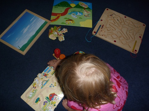 Sometimes I just reach into the cabinet and bring out five activities and spread them around us hoping something will catch her attention (second picture). And sometimes, I wind up homeschooling with ED climbing on my back and head (no kidding!!).  Ugh!  So, it’s often a challenge — and I’m often left feeling that I haven’t “done enough” quality work with DD (or LD).  The other ‘problem’ is that the kids play so happily that it’s hard to draw them back to what *I* want to accomplish.