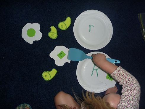 I don’t remember where I saw this idea, but it obviously goes with the book Green Eggs and Ham. I don’t remember why I chose the letter R–we were probably doing rainbows at that time (as I recall).