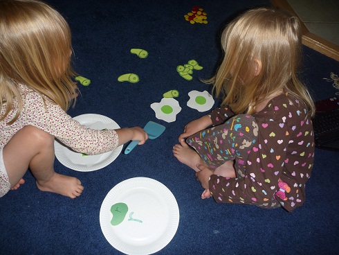 I made this a while ago, but never got around to introducing it to ED. It was a big hit the yesterday. Then DD came over and wanted to play. I had a number of extra eggs and ham without a letter on the reverse side, so they took turns trying to find the letter for their plate. If they got a blank egg or ham it was the other person’s turn.
