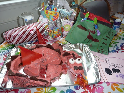 | The kids decided Dad should have a dragon-themed party (in honor of Ferno from LD’s Beast Quest books). I’m no cake-maker (my friend M is amazing!!!), but the kids were happy with the results! |