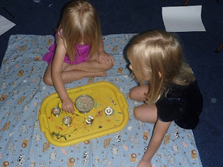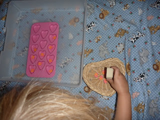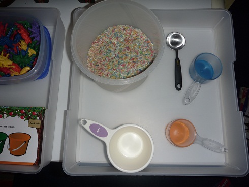 Later in the week I switched the rice activity to a cup measure (white) and 1/4 cup and 1/3 cup. They had to figure out how many orange (or blue) cups would fill up the one-cup measure.