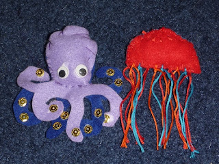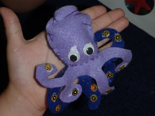 DD made the octopus. LD made the jellyfish. ED made the fish. DD and LD did the sewing completely on their own, although I threaded the embroidery thread through for the tentacles and LD did the knotting. I had to show ED where to place the needle. She only stabbed me once!