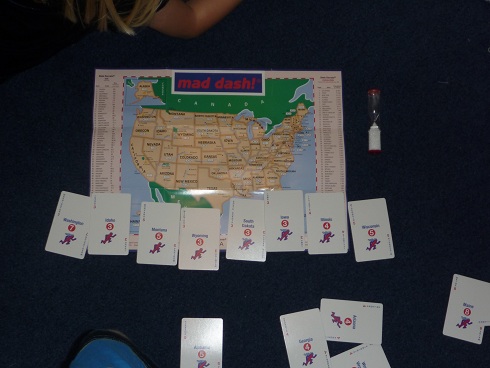 We’ve been playing lots of rounds of Mad Dash. This is a geography game I’ve had for years. We play it as a one-team game competing against our previous scores. We get 25 cards and then start the timer. The object is to place the state cards in a row (states have to touch their neighbors) trying to make it across the country as far as possible. The cards have a certain number of points and after the time runs out you add up your points. The more neighbors a state has, the fewer points it’s worth.