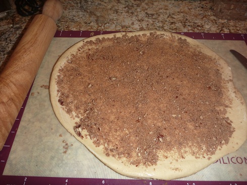 **take 1/2 the dough and roll out on a floured surface into a rectangle about 6 inches by 10 inches (1/2 inch thick or so). Spread some softened butter and then sprinkle on some pecan mixture. (See the picture below.) Roll the dough from the long side and slice into 3/4 inch slices. Place in buttered