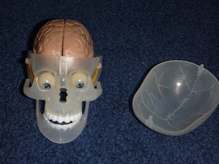 We opened one of the kits we got this summer and put together the various bits (the eyes and teeth pop in, you connect the jaw bone, add the brain and the top of the skull).