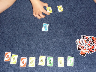 We’ve also been playing lots of games together in the morning; Uno is her current favorite (though we usually play a couple of board games as well). It’s great for number recognition. She got this mini-Uno card set at a friend’s birthday party. Another current favorite is Blink.