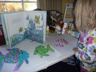 ED and I always get up an hour or two before the others. We cuddle up in front of the fire first thing and read books. We often do a craft to go along with it. I loved this picture because Crystal, the kitten, was so hands-on with this activity!!