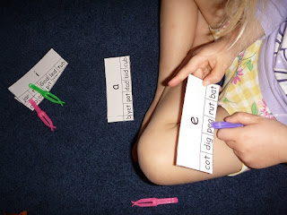 Back a couple of years ago Honey over at Sunflower Schoolhouse made a collection of clothes peg activities. I brought out this alphabet matching activity for ED last week. The plain letter matching was a bit too easy for her.