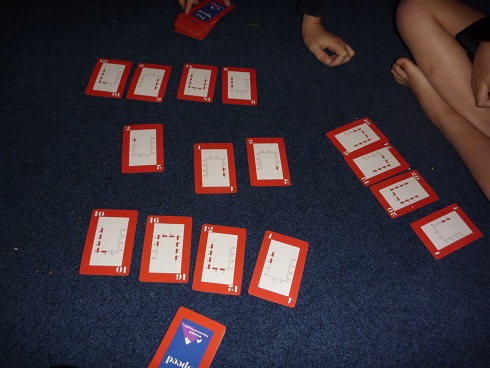 In the picture to the left you can see LD is placing a card in the middle. He’ll need to quickly place 2 more cards face up (for a total of 4) to play from in front of him. I also have just 2 cards down in the picture and need to place two more face up since there are always supposed to be four in front of you (until your hand is empty).