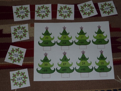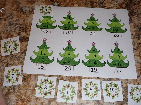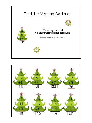 You can download your own copy of the Missing Addend Game here. It’s possible I’ll add another page of trees and wreaths in a few days. In the mean time I’ll make this first page available to those who could use it.